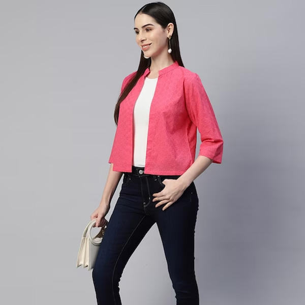 Pink self design open front regular shrug ,has three-quarter sleeves, straight hem